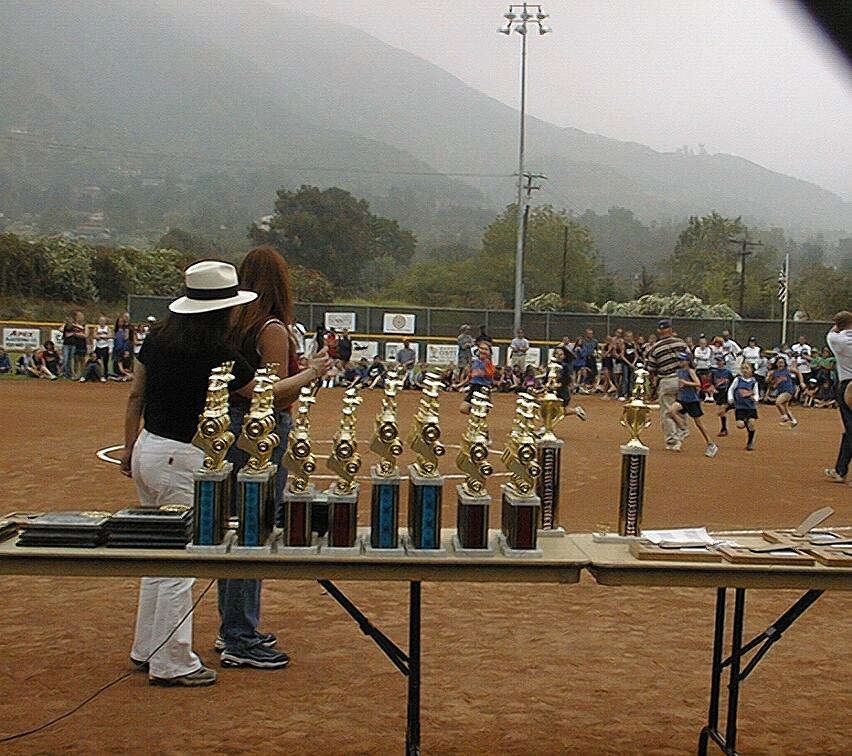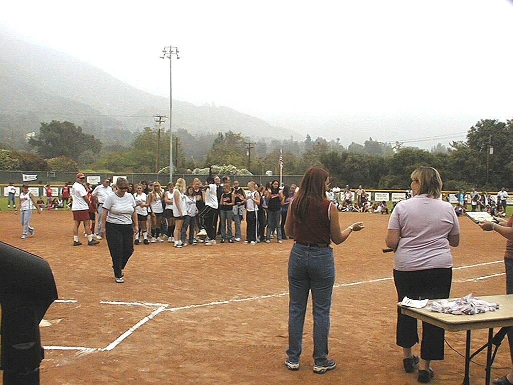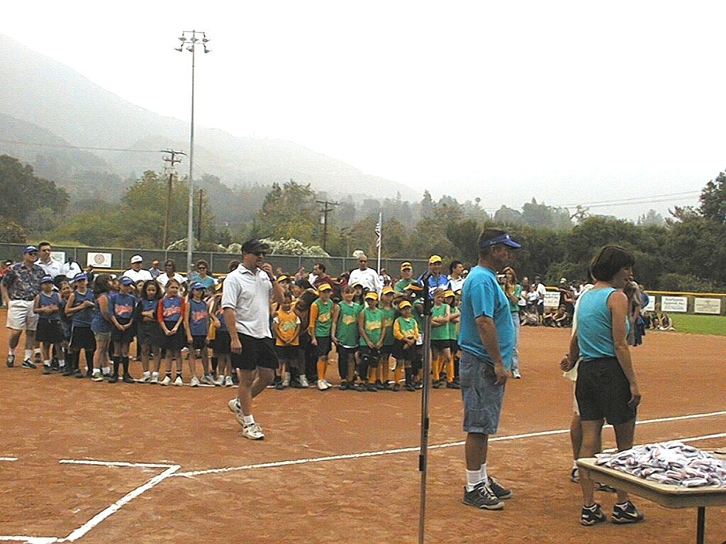 SMGSA Holds Closing Ceremonies Sunday Closing ceremonies for the Sierra Madre Girls' Softball Association were held Sunday at Memorial Park. Trophies were given to the first and second place team in each division, and all girls received a ribbon medallion for participating. After the ceremonies, championship games were held in each division. All of these pictures were taken from a distance, through a chain link fence, so the quality may not be the best. But Aunt Lucy in Dubuque will still get to see little Suzy on the internet. Click on the pic to see it larger.