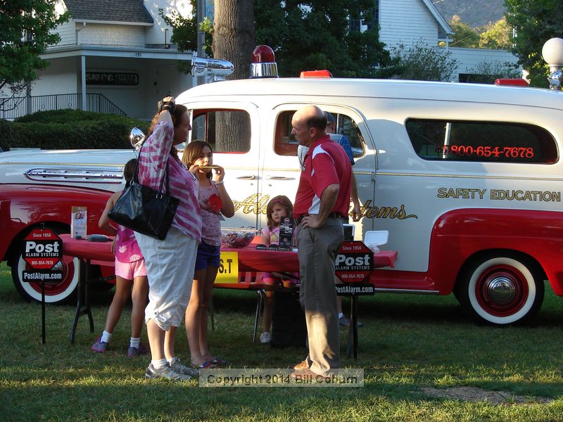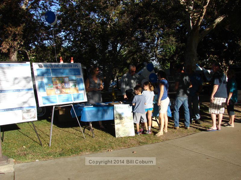 Posted 8/10/14 – Sierra Madre Police Department participated again Tuesday night in the annual National Night Out community outreach program, now in its 31st year, including the last several here in town. Memorial Park was filled with booths with educational literature and volunteers to answer questions about many community, police, fire and safety programs. The world famous Sierra Madre Search and Rescue team was on hand, as were SMPD volunteers, SMPD staff, SMFD volunteers and staff, members of CERT, and the HAM Radio communications team that assists in local events and during emergencies. There were games and face-painting for the kids, local non-profits such as Rotary, and a booth from the Public Works Dept., where residents had a chance to learn about some of the Water Dept. equipment, including the City’s water valve exerciser, a huge vacuum used to suck water and debris from under ground and around water meters, and a hydrant flusher. There were also handouts about the City’s new water ordinanc, which severely restricts residents ability to use water during the current drought and dry-well conditions. You can read about that ordinance here.