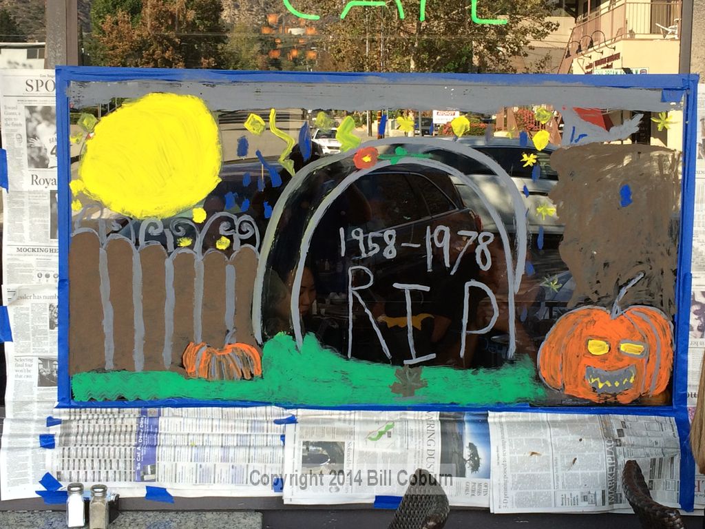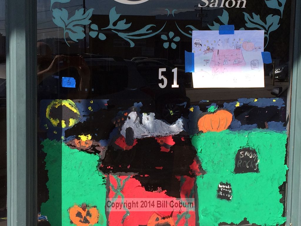 Posted 10/25/14 – I posted photos of the kids painting the windows of the local businesses downtown for Halloween yesterday, and now I’ve gone back and taken photos of the completed windows, without the kids in the way, so you can see the finished art. Enjoy the photos. Main Halloween Page 2014 Halloween Index page