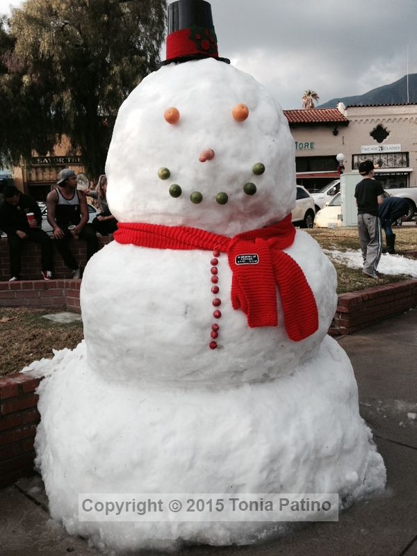 Posted 12/23/15 – Every year since 1988, with the exception of 2010, Frosty has arrived in Kersting Court at some time during the holiday season. Originally, he was on Sierra Madre Blvd. up near the west end of the park by the crosswalk, for some time now he’s been on Baldwin Ave.. He’s arrived on Christmas Eve, the night of the candlelight walk, New Year’s Eve, but he’s pretty much always arrived, again. And now he’s back!!! Thanks to Dave Forrester, Andrew Graper and a host of others, he’s back, and bigger than ever! Thanks to Pickwick Ice in Burbank, which donates the “snow” to build our very own Frosty. And thanks, too, to Tonia Patino for the photos!