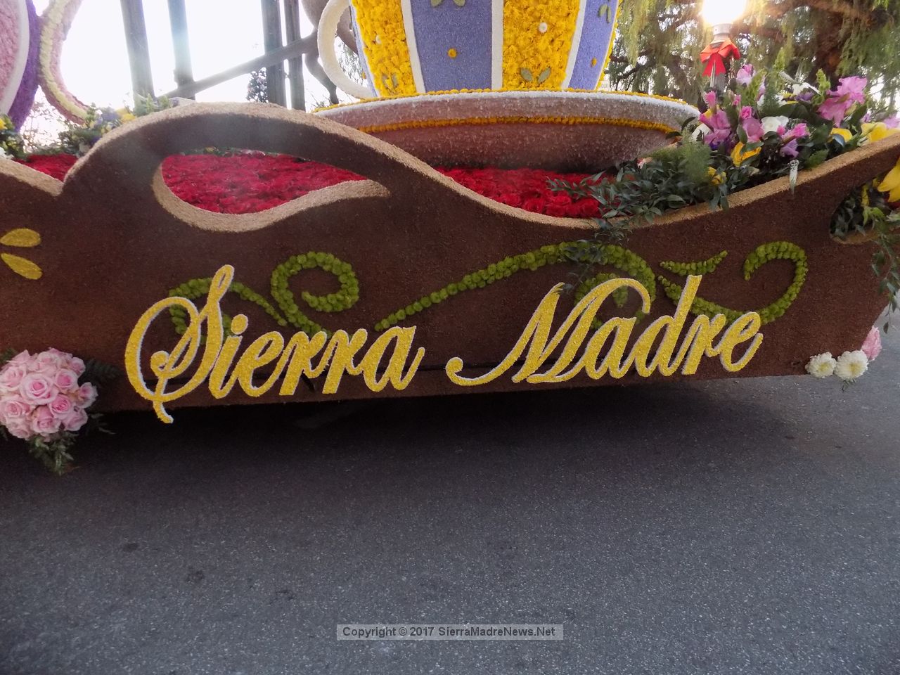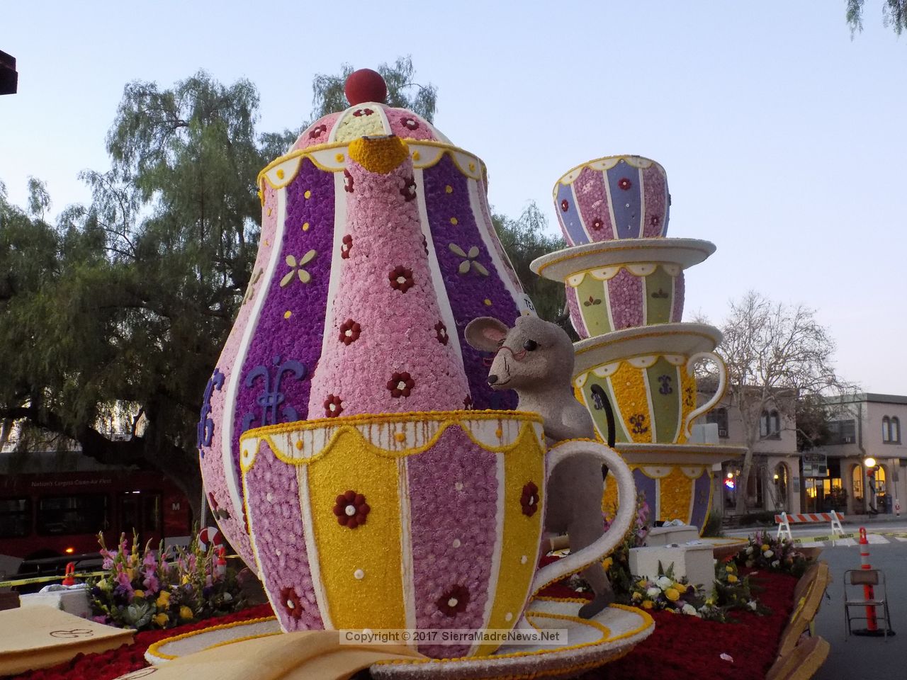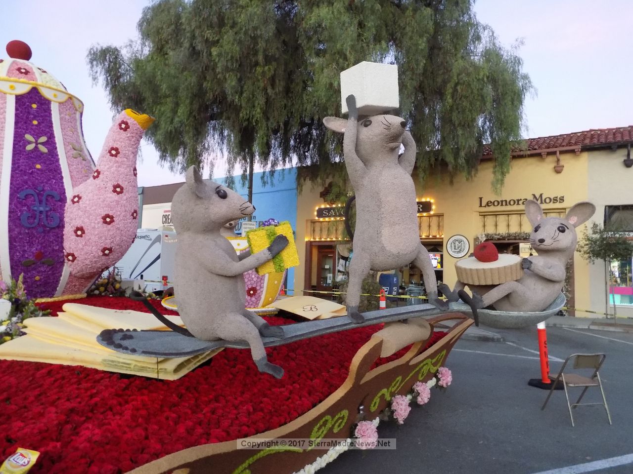 Posted 1/4/17 – Sierra Madre Rose Float Association’s “The Cat’s Away”. winner of the Mayor’s Trophy in the Tournament of Roses Roses Parade, is currently in Kerting Court until this afternoon. What time this afternoon is still up in the air, since the float has water sensitive equipment on it, and the forecast calls for a chance of rain, starting with 10% at noon, moving to 20% at 2pm. So, you’ll want to get there early if you can, get your up close views of the SMRFA masterpiece, take a selfie or three, and buy flowers to help pay for the 2018 float. If you can’t make it down, enjoy this photo gallery shot just before sun-up this morning. Also, take a quick walk around the float with no crowds by watching our 360 video available at our Facebook page, at https://www.facebook.com/SMNewsNet