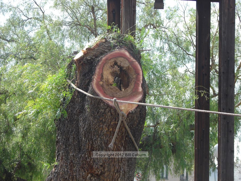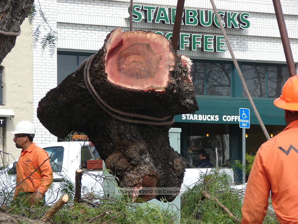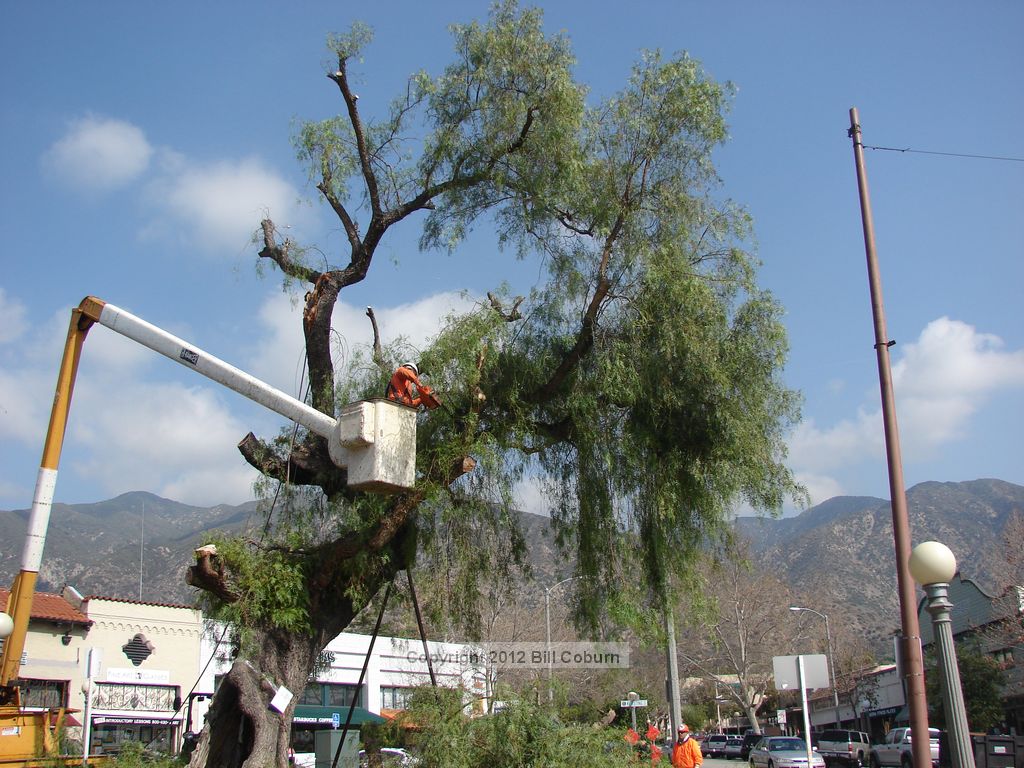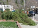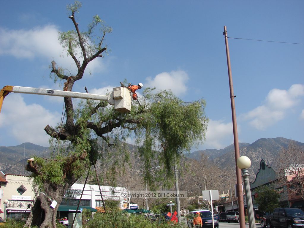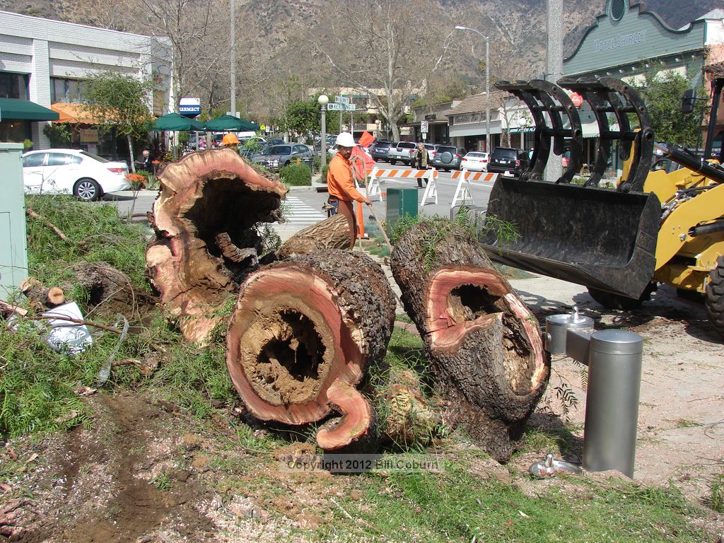 Posted 2/29/12 – Tomorrow, March 1st, 2012, will be the first day in more than 45, 500 days that the sun has risen on Kersting Court and will not create shade from the main pepper tree, planted in the 1880s (1887?) by a teacher at Sierra Madre School, which was located at that spot at the time. While it is sad to see it gone, as you look through these pictures of the tree being removed, it is obvious that there was too much disease in the tree to allow it to remain. The hollowed out branches and trunks are evidence that they were structurally unprepared to handle their own weight. By the way, for those who wish the City had hired a local contractor to take the tree down, I’m told that both Osti Tree Service and Anderson Tree Service declined to take the job on. Probably a good move, would you want to be the local company that took down everyone’s favorite tree?