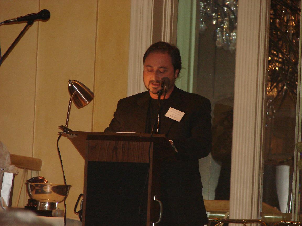 Candace Coder-Chew, director of print and graphics at Santa Anita, was the first to speak, and she was followed by last year’s Citizen of the Year, Bud Switzer, who spoke a little about Pete’s background. Siberell was also recognized by the Methodist Hospital Foundation. Rotarian Rudy Hayek talked about Pete’s role with Sierra Madre Rotary Club, and then Jim Liston of CATZ did a short slide show and talked about Pete’s service on the Community Services Commission and as head of the Trail Race, finishing up by acknowledging what he is sure is Pete’s favorite role, as husband and father. Phil Gleason, Siberell’s friend who is also involved with Sierra Madre Little League, also had a few words to say about his fellow coach.
