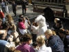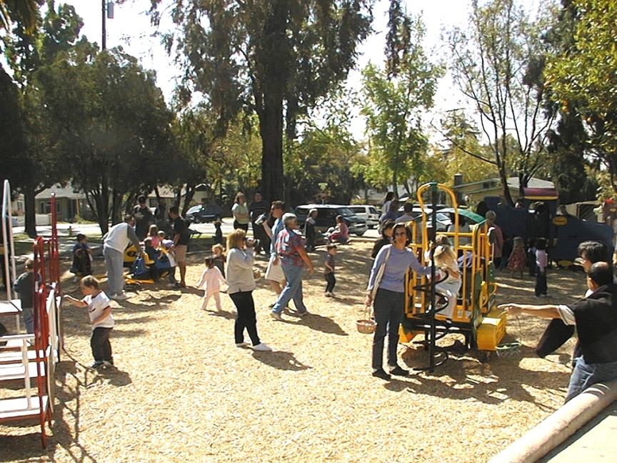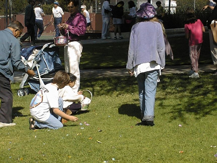 Saturday, April 19, 2003 Back to Easter Egg Hunt Main Page SMVFA Hosts Easter Egg Hunt, for 73rd Time The Sierra Madre Volunteer Firefighter's Association, which began hosting the Annual Easter Egg Hunt back in 1931, did it again on Saturday. The crowd appeared to be a little smaller, (possibly just our vantage point) but the enthusiasm of those in attendance was every bit as rabbit (bad joke) as always. Kids swooped on 75,000 pieces of candy, and a total of 36 golden eggs were discovered and swapped for "bonzo" baskets. A great time for the firemen, who love doing it, and for all the kids, who love the hunt, and the parents, who love the kids' hunting, and the firemen for doing it. And let's not forget the Easter bunny, who arrived on a fire engine shortly before ten!! Here's a video of the