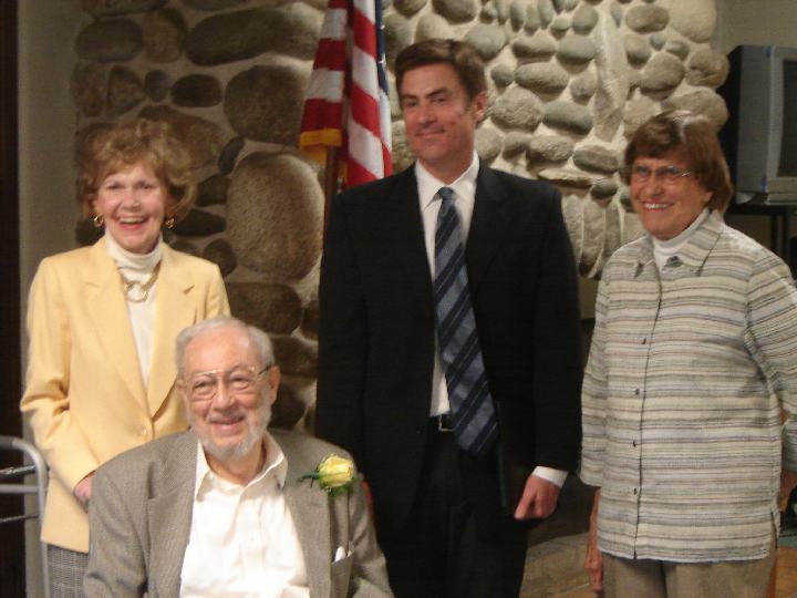 Eph Konigsberg Honored as Sierra Madre’s Older American, 2008 Pictures Video Back to Older American main page Friday, May 9, 2008 At a reception Friday afternoon in the Hart Park House, aka the Senior Center, Eph Konigsberg was recognized as Sierra Madre’s Older American for 2008. After some brief opening remarks by Senior Community Commission Chair Nancy Walsh, Hank Landsberg, president of Sierra Madre Kiwanis stepped to the mike and said a few words, noting that among Eph’s other accomplishments, such as being a founding member of Sierra Madre Community Foundation, a Library Board member, a member of the Historical Society, and being “the guy who had the great idea to underground the utilities up on North Baldwin,” he’s best known to Kiwanians as a man they can “always count on to give an impromptu program, anytime, regarding whatever he’s growing and eating out of his garden, cumquats, loquats, and other kind of quats that we’ve never heard of.” After Landsberg noted that it was “an honor to know you, and an honor to have you as part of the Sierra Madre Kiwanis,” he introduced Mayor Kurt Zimmerman. The mayor then gave a brief biographical look at Konigsberg. Mayor Zimmerman was joined by Council members Mosca and Buchanan, Police Chief Marilyn Diaz, Library Director Toni Buckner, and several commissioners in representing the City at the event. Council member Don Watts did not attend. Mayor Pro Tem Maryann MacGillivray, who was traveling back east, sent a very complimentary statement to be read by Mayor Zimmerman, noting that the term “older can only apply to the chronology of years, and perhaps a few aches and pains, but certainly not to your spirit, love of life and compassion for people.” She suggested that when she returns, perhaps they can discuss “older than what?” Zimmerman than presented Konigsberg with a proclamation designating him as Older American of the Year for 2008. Proclamations honoring Konigsberg were also presented by Corey Calaycay of Senator Bob Margett’s office, Mark Harmsen of Congressman David Dreier’s office, and Rita Hadjimanoukian of Supervisor Michael Antonovich’s office. Toni Buckner also made a presentation to Eph on behalf of the Library board, and the Friends of the Library, noting that he “actively advocates for Libraries as places of opportunity, education, self-help and intellectual freedom.” She also pointed out that he “always remembers the teens…fought for them, and thought about them, and I find that very admirable…” Konigsberg’s neighbor Ron Coleman said a few words, noting that “any time Eph talks, you really need to listen…you will learn something every single time.” Historical Society president Dane Lenton also spoke, thanking Eph for his contributions to the Sierra Madre history book that is nearing completion, for “his time, his resources and his talents.” Then Eph got up to speak, and the crowd seemed to go silent in anticipation of what he would say. He began by noting that three members of the very first committee he was on, the transportation committee, were in the audience, and drew a laugh when he noted “so, we’re still here.” He pointed out that people often ask how he is doing, and said it could best be expressed by quoting Arthur Guiterman, who said “The tusks which clashed in mighty brawls of mastodons, are billiard balls. The sword of Charlemagne the Just is ferric oxide, known as rust...Great Caesar's bust is on the shelf - and I don't feel so well myself.” This drew another round of laughter from the appreciative audience.Noting that in his biographical introduction, Mayor Zimmerman had discussed his skills as a debater, he told the audience that it should be no surprise that he would have a rebuttal. He added that it would truly be a rebuttal, because at previous Older American “soirees” that he had attended, the discussion always centered on what the honorees had done for the City, and he wanted “to talk about what I’ve learned working with the City.” He discussed attending a City meeting when he had just moved to Sierra Madre nearly fifty years ago, and how he had spoken up in favor of a tax to help the Library, noting that it would cost each family about a popsicle per month, and that his comment was so well received that the motion passed. He said he learned from that that “You don’t have to be a long-time resident, you don’t have to be a member of a committee, you don’t have to be a member of a commission or a board, if you can throw some light on the subject, and bring some perspective to the matter, things will work themselves out….” He then discussed having served on three tree committees, and that the first two brought forth a tree ordinance that got shot down. But the third brought an ordinance that passed, and from that he learned, “If at first you don’t succeed, try, and try again.” The third lesson had to do with the treatment of a woman at a City Council meeting who was obviously disoriented, by former Mayor Gary Adams. He said that Adams had been so gentle in asking her to meet with him after the meeting to discuss her issue. He said that the treatment was “charming to see, and it made me a convert of Sierra Madre, the only place I really want to be.” He then discussed his time on the Committee that undergrounded the utilities on Baldwin Ave., and how there were lots of difficulties, and lots of disagreements among the members, but that the polarized committee accomplished its common goal, despite all of them. From that, he said he learned that “It’s not enough to be willing to compromise, it’s better to have a committee in which all of them are aggressively pursuing what they can compromise on.” He added that many of the things he had discussed were things he was sure those in the audience already know, but “it’s one thing to know it, and it’s another to learn things in your own life. It’s the 